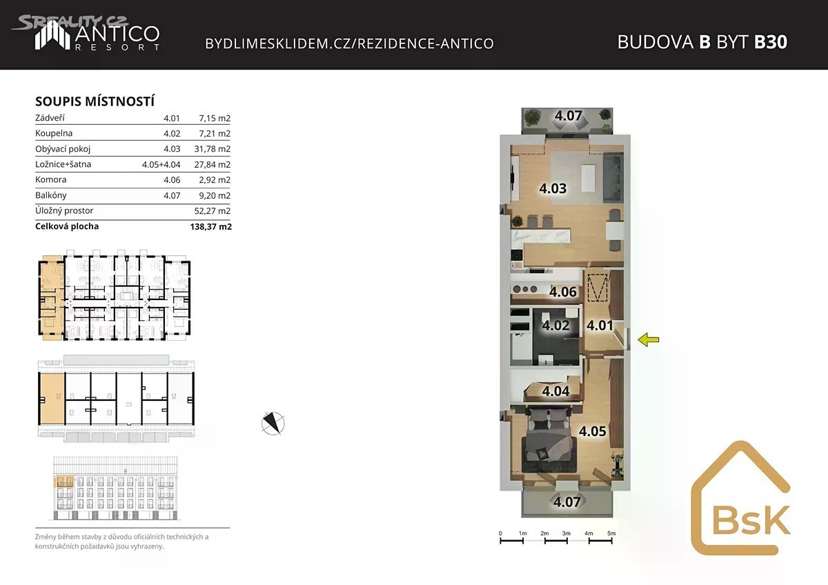 Nabízíme k prodeji moderní a prostorný byt 2+kk o ploše 138,37 m², který se nachází v 4. nadzemním podlaží moderního projektu Resort Antico v Českém Brodě s výbornou dostupností do centra města. Tento byt vyniká kvalitními materiály a pečlivým provedením garantujícím komfortní bydlení pro jednotlivce či páry. Byt je chytře dispozičně řešený. Po vstupu do bytu vás přivítá zádveří o velikosti 7,15 m², které poskytuje dostatek prostoru pro úložné skříně a pohodlný přístup do dalších částí bytu. Koupelna o výměře 7,21 m² je vybavena moderními zařizovacími předměty a nabízí ideální místo pro relaxaci po náročném dni. Hlavní obytná místnost s kuchyňským koutem a balkonem o velikosti 31,78 m² je světlá a vzdušná, což vytváří příjemnou atmosféru pro bydlení. Ložnice s šatnou o ploše 27,84 m² nabízí klidné útočiště a dostatek prostoru pro pohodlné spaní. Úložný prostor o velikosti 52,27 m² je praktickým bonusem, který umožňuje organizované uskladnění vašich věcí a přispívá k celkovému komfortu bydlení. Projekt Resort Antico vychází z historie místa, kde se dříve nacházel známý truhlářský areál „Antico“. V současnosti zde vzniká rezidenční zástavba citlivě navazující na okolní rodinné domy s dobrou dostupností do centra města. Skládá se ze 6 bytových a 2 vilových domů se 143 bytovými jednotkami různých velikostí a dispozic nabízející široký výběr podle Vašich potřeb. Byty jsou navrženy tak, aby maximálně využívaly prostor a poskytovaly příjemné a moderní prostředí pro život. Otevřený koncept obývacího prostoru s kuchyňským koutem vytváří příjemnou atmosféru. V každé jednotce jsou použity kvalitní materiály zajišťující dlouhou životnost a vysoký standard bydlení. Ke každému bytu nabízíme možnost přikoupit sklepní prostor, podzemní garážové stání, venkovní stání či místo v parkovacím zakladači, kde pohodlně zaparkujete i s SUV. Informace o standardech, umístění jednotky, lokalitě, dopravní dostupnosti do okolních měst včetně Prahy, nabídce služeb či volnočasových aktivit najdete na našich webových stránkách. Odkaz na tyto stránky naleznete níže u developerského projektu Resortu Antico umístěného níže nad kontaktem makléře. Rádi Vám zajistíme financování koupě na míru a komplexně se postaráme o prodej stávající nemovitosti v případě, že budete kupní cenu hradit částečně či zcela úplně právě z prodeje. Přijďte se přesvědčit o kvalitách tohoto jedinečného projektu a objevte svůj nový domov. Těšíme se na Vás na prohlídkách.
