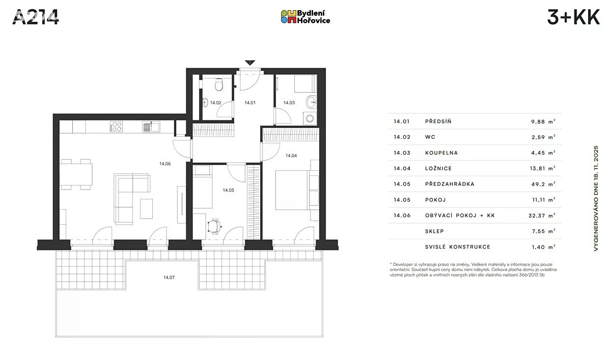Nabízíme k prodeji byt 3+kk č. A214 o celkové ploše 124,81 m2 s předzahrádkou a sklepem. Byt se nachází v 1. nadzemním podlaží domu 5. etapy budovy A2 projektu Bydlení Hořovice. Plocha předzahrádky je 49,2 m2, plocha sklepa je 7,55 m2. Nastěhování léto 2026. Představujeme projekt Bydlení Hořovice Bydlení Hořovice nabízí moderní byty v malebném středočeském Hořovicku, navržené pro komfortní a kvalitní bydlení mezi Prahou a Plzní. Vynikající lokalita Hořovice nabízí snadnou dostupnost do Prahy a Plzně po dálnici D5 i vlakem. Město je bohaté na historii, kulturní dědictví a nabízí kompletní občanskou vybavenost - nemocnice, školky, školy, obchody a služby. Moderní byty s prvotřídním vybavením Byty různých velikostí a dispozic jsou navrženy s důrazem na kvalitu a komfort. Nabízí kvalitní podlahy, elegantní interiérové vybavení, energetickou úspornost, prostorné balkony, parkování a možnost personalizace bytu. Příroda a volný čas Okolí Hořovic nabízí krásné přírodní scenérie, pěší turistiku, cykloturistiku a další volnočasové aktivity. Zhodnocení investice Bydlení Hořovice je výhodná investice díky kvalitní stavbě a atraktivní lokalitě, zajišťující stabilní a rostoucí hodnotu nemovitostí. Proč vybrat Bydlení Hořovice? Nabízí kombinaci klidu a výborné dostupnosti do velkých měst s vysokým standardem stavebních materiálů a vybavení.