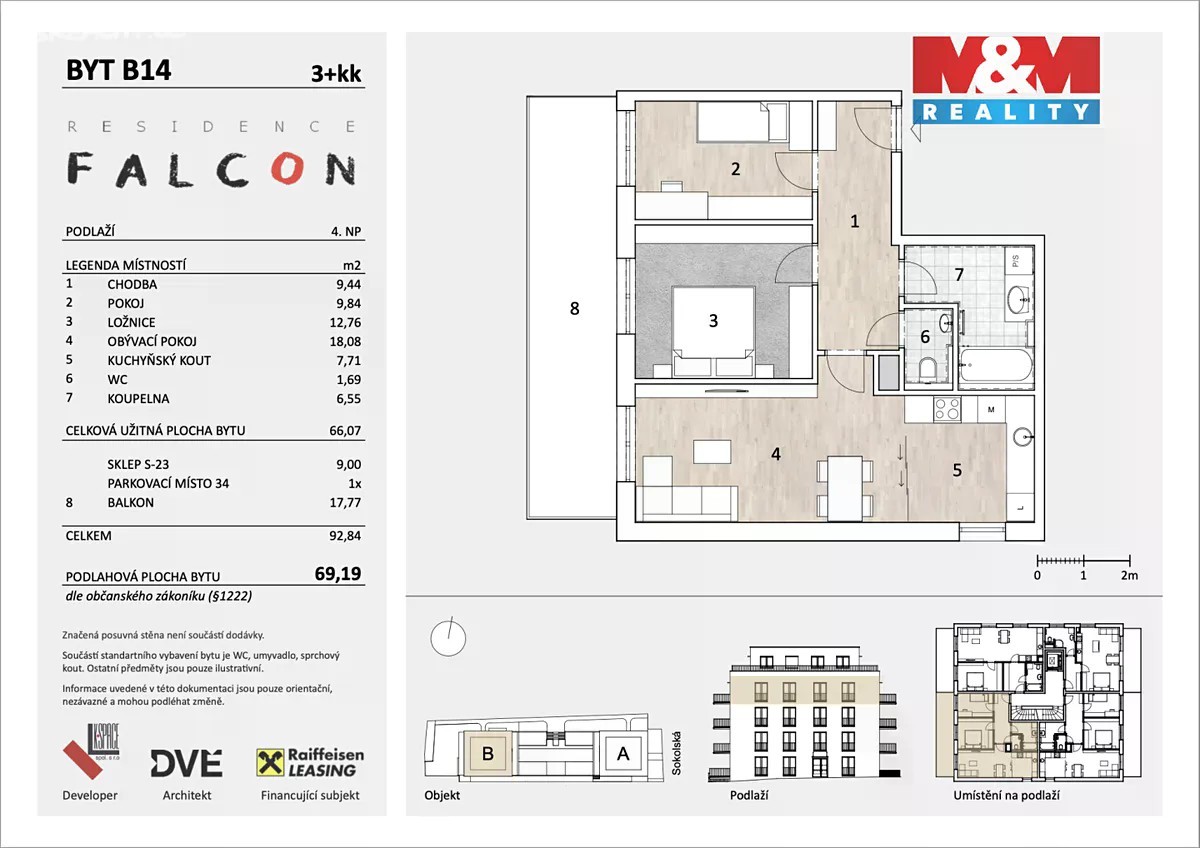 Rezidenční projekt Residence Falcon tvoří dvě budovy umístěné v klidné lokalitě Mělníka - ul. Sokolská. Oceníte rychlé spojení do Prahy (cca 30 min metro Letňany, PID), kompletní občanskou vybavenost v docházkové vzdálenosti a školu přímo v lokalitě. Okolí je ideální pro aktivní život - zeleň, cyklostezky, sportovní zóny, prostor pro odpočinek. Nabízíme nejdostupnější 3+kk jednotku v projektu, s podlahovou plochou 66,07 m², umístěnou ve 4. NP. Součástí ceny je balkon 17,77 m², prostorný sklep 9 m² a parkovací stání. Standardy Friendly a Gorgeous umožňují volbu stylu dokončení - oba pracují s kvalitními materiály, trojskly a velkoformátovým prosklením. Prodej i výstavba už byly oficiálně spuštěny. Residence nabídne oplocení, kamerový systém, kontrolovaný přístup a chráněné atrium. Dokončení 3. kvartál 2027. Pro porovnání dalších dostupných 3+kk i jiných dispozic nás neváhejte kontaktovat - Rádi Vám zašleme kompletní přehled.
