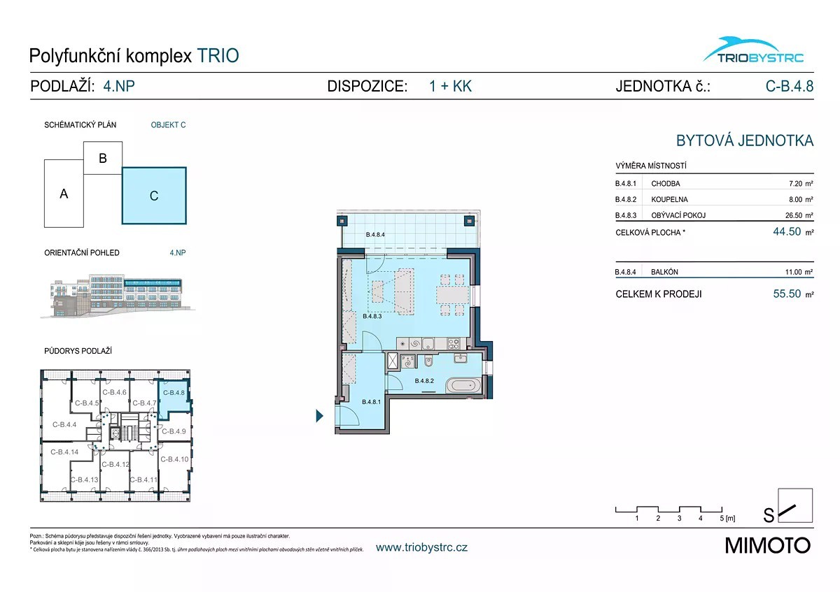 Představujeme vám projekt TRIO Bystrc Brno, který přináší výjimečný energetický standard bydlení v krásné lokalitě Bystrc. Nabízíme vám byt s klidným výhledem do zeleně. Tato jednotka má dispozicí 1+kk (celkové plocha 55,5 m²) a nachází v 4.NP budovy C s orientací na jihovýchod. Všechny jednotky v tomto projektu se pyšní vysokým standardem vybavení koupelny a toalety, které podtrhují velkoformátové obklady italské společnosti IMOLA. Podlahové vytápění, rekuperace vzduchu (výměna vydýchaného vzduchu za přiváděný čerstvý vzduch z venku při zajištění energeticky efektivního zadržení tepla uvnitř bytu), chlazení v letních horkých dnech a příprava pro předokenní žaluzie - to vše přináší maximální komfort po celý rok pro tuto jednotku. Projekt TRIO Bystrc je zařazen do energetické kategorie třídy A díky výjimečným energetickým vlastnostem. Fotovoltaické panely, tepelná čerpadla a další technologie zajišťují ekologický provoz a tepelný komfort po celý rok. K dispozici je skladovací kóje na patře přímo u bytové jednotky pro ještě větší pohodlí. Bystrc nabízí široké možnosti aktivního života v těsné blízkosti přírody. Široký výběr obchodů a služeb, poliklinika, školy i školky, Brněnská přehrada, Údolí Oddechu nebo zoologická zahrada jsou jen pár minut pěšky od vašeho nového domova. Užijte si klid, sport a relaxaci v jedné z nejlepších lokalit Brna! Kontaktujte nás ještě dnes! Zajímá vás víc? Navštivte naše webové stránky a najděte si svůj vysněný byt nebo ideální investiční příležitost! Těšíme se na osobní setkání, kde probereme vaše představy a přání. Prodej je přímo od developera, takže neplatíte žádné provize ani poplatky navíc! Dokončení projektu je naplánováno na Q1/2027.