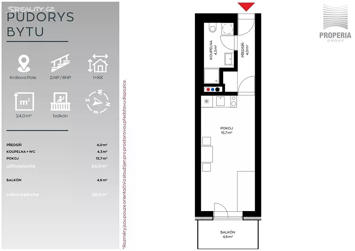Tento útulný byt 1+KK v Králově Poli vás okouzlí na první pohled. Nabízíme k prodeji světlý a prakticky řešený byt 1+KK v atraktivní lokalitě Brno - Královo Pole. Byt o celkové podlahové ploše 26,0 m² se nachází ve 2. nadzemním podlaží novostavby bytového domu s výtahem, což zajišťuje moderní standardy bydlení a nízké provozní náklady. Dispozice zahrnuje předsíň, koupelnu se sprchovým koutem a toaletou a hlavní obytný prostor s kuchyňským koutem. K bytu náleží i balkon o rozloze 4,6 m². Díky promyšlenému uspořádání nabízí byt dostatek prostoru pro pohodlné bydlení. Byt je ideální volbou pro studenta, mladý pár nebo jako investiční příležitost k pronájmu. Lokalita Královo Pole patří mezi nejvyhledávanější městské části Brna - skvělá občanská vybavenost, blízkost přírody i snadná dostupnost centra města MHD nebo autem dělají z této adresy ideální místo pro aktivní život. V okolí najdete obchody, kavárny, restaurace, sportoviště i vysoké školy.