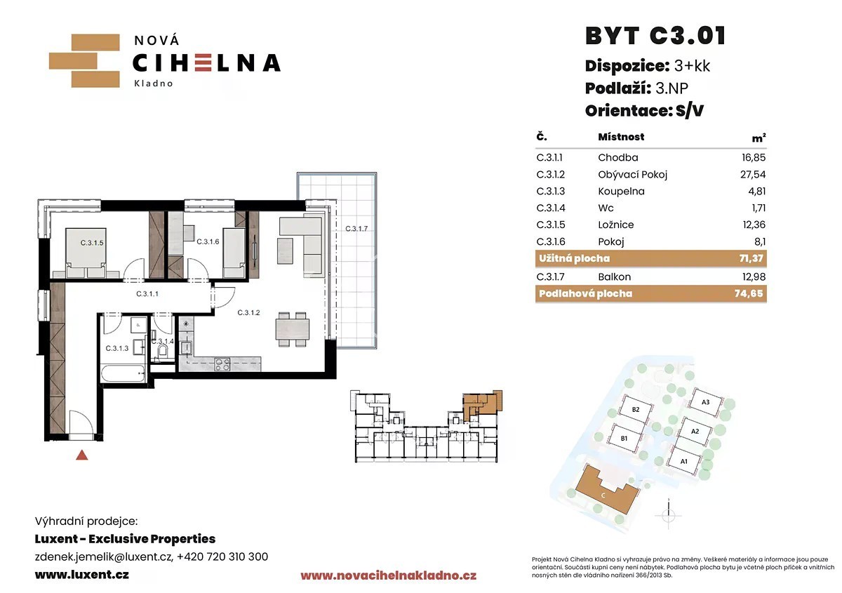 Nabízíme k prodeji byt 3+kk o podlahové ploše 74,65 m² s balkonem 12,98 m² v mimořádně úsporném developerském projektu Nová Cihelna Kladno vznikajícím v městské čtvrti Kladno - Rozdělov. Nová Cihelna je developerský projekt, který v sobě spojuje nejen nejmodernější technologie, udržitelnost a architekturu, ale zároveň poskytuje svým uživatelům propojení a blízký kontakt s přírodou, okolní zelení i společným prostorem. Městská čtvrť Kladno - Rozdělov je nejlepším místem pro život s přírodou nadosah a současně perfektním spojením do Prahy. Byt je situován ve 4. NP novostavby, interiér zahrnuje předsíň, prostorný obývací pokoj s kuchyňským koutem a jídelní částí, ložnici, další pokoj, který může sloužit například jako pracovna, dětský pokoj nebo další ložnice, koupelnu s vanou a samostatnou toaletu. Z obývací části je vstup na balkon s krásným výhledem do okolí. Byt je orientován na SV stranu. K bytu náleží sklep a je zde možnost dokoupení garážového stání. Byty jsou umístěny v celkem 6 nízkoenergetických domech, což zaručuje příjemné komorní bydlení, s 1000 m² zahradou s parkovou úpravou pro komunitní setkávání, posezení a příjemný odpočinek. Bude zde také koncipováno dětské a workoutové/fitness hřiště. Projekt energetické třídy A klade důraz na nízkoenergetický provoz a udržitelnost. Počítá vytápěním tepelným čerpadlem vzduch-voda, podlahovým topením s možnosti dochlazení, řízeným větráním s rekuperací i úsporným řešením užitkové vody. V koupelnách budou designová topná tělesa a podlaha elektricky vyhřívaná. Součástí budou i FVE na střechách a velkoformátová okna s izolačním prosklením pro dostatek přirozeného světla. Vinylové minerální podlahy (v nadstandardu dřevěné), designové obklady a keramická dlažba na výběr z několika dekorů. Projekt nabízí nadstandardní a udržitelné materiály, v koupelnách zařizovací předměty od firmy Villeroy Boch, Hansgrohe. Hlavní důraz je kladen na originalitu, funkčnost a estetiku. Celý komplex je přizpůsoben pro bezbariérový přístup včetně výtahů. Poloha projektu umožňuje vynikající spojení do Prahy - autem díky dálnici D6, autobusem díky přímému spoji na Zličín či vlakem do centra Prahy díky plánované rychlodráze. Pražský Zličín dostupný autem za 20 min, u domu zastávka MHD Kladno, Rozdělov s přímým spojem na Zličín. V bezprostředním okolí projektu se nachází veškerá občanská vybavenost. Školy a školky, restaurace, kavárny, nákupní centra, oblastní nemocnice. Okolní krásná příroda a sportovní areály skýtají možnosti pro rozmanité sportovní aktivity a pěší nebo cyklistické výlety. Developerem projektu je společnost Pierre Grafen a.s. Dokončení projektu je plánováno na 4Q 2027.