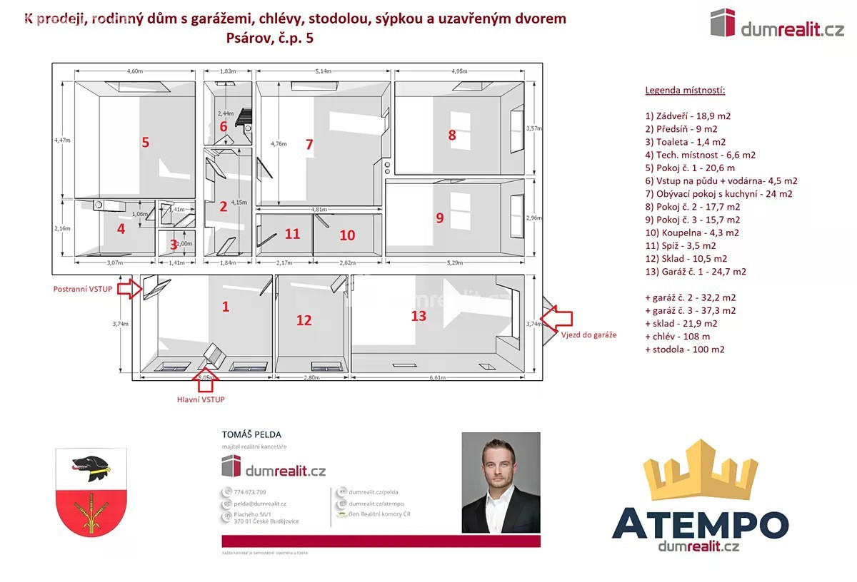Naše společnost Vám zprostředkuje prodej rodinného domu 4+kk v započaté rekonstrukci (nová střešní krytina) s garážemi, chlévy, sýpkou, stodolou, předzahrádkou a pozemkem v uzavřeném dvoře v obci Psárov, č.p. 5. Prodávaný rodinný dům je ze smíšeného zdiva a má dobrý základ s novou střešní krytinou, plastovými okny a nabízí variabilitu dispozičního uspořádání vzhledem k nosným a nenosným konstrukcím domu, možnost vytvoření podkroví na půdě. Dům je vytápěný kotlem na tuhá paliva a elektrokotlem. Ohřev teplé vody je elektrickým bojlerem. Objekt má vlastní studnu s pitnou vodou. Kanalizace je řešena septikem. Doporučuji prohlídku, na pozemku je dostatek staveb k vlastní realizaci. Možnost dokoupit další pozemky za domem a les. K dispozici máme kompletní pasportizaci stavby. Více informací Vám poskytne realitní makléř Tomáš Pelda z realitní kanceláře A TEMPO fungující pod ochrannou známkou naše společnost. Ev. číslo: 653310.