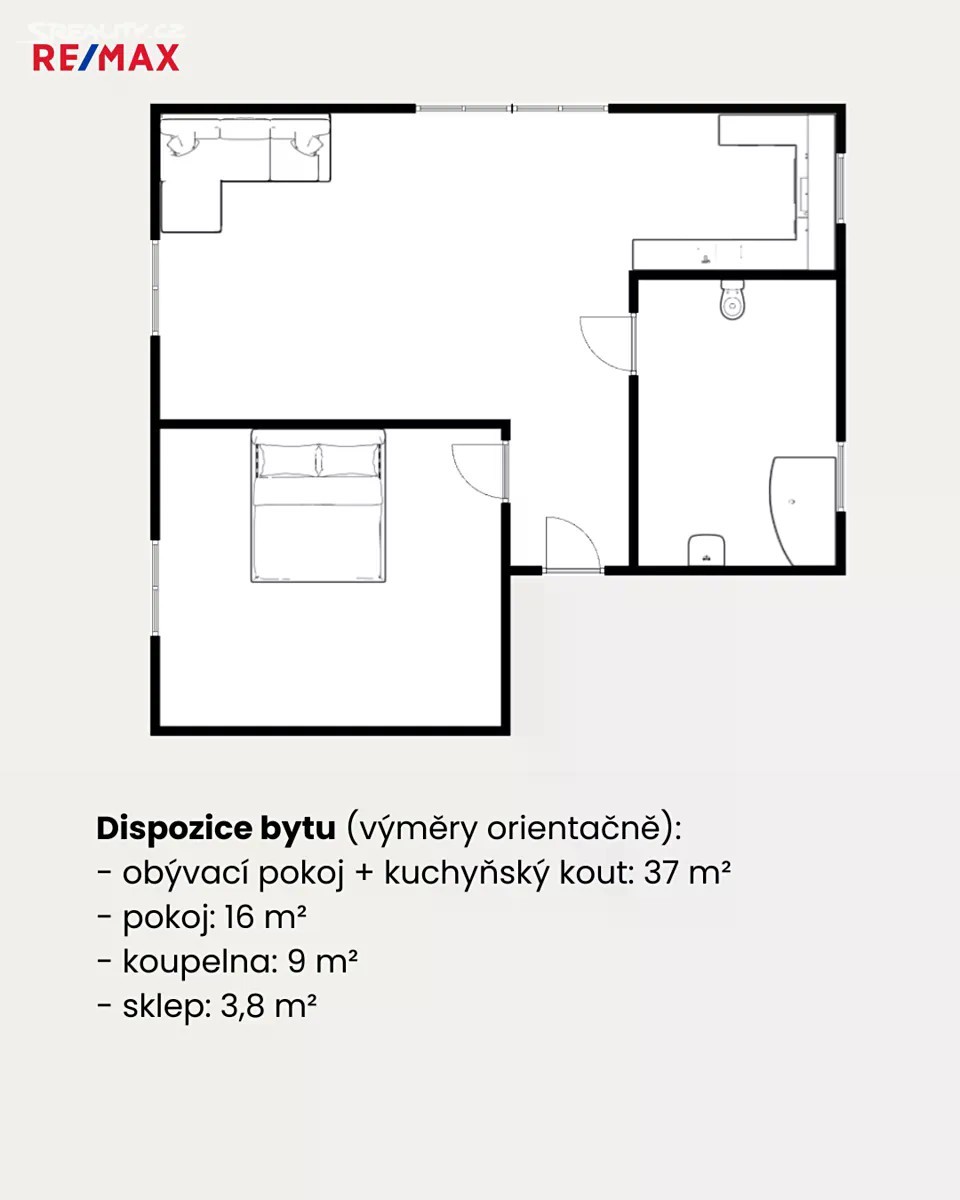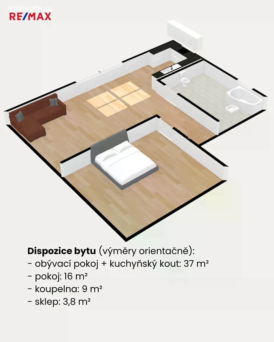 Nabízím Vám ke koupi atraktivní bytovou jednotku ve 4. patře o dispozici 2+kk, která se nachází na adrese Dvořákova 231, Opatovice nad Labem. Byt vznikl střešní přístavbou na cihlový bytový dům v roce 2001. Samotný dům byl kolaudován přibližně v roce 1960 a v průběhu let prošel důležitými rekonstrukcemi. V roce 2015 byla provedena oprava střechy, v roce 2018 výměna stoupaček a objekt je navíc kompletně zateplen (vč. střechy). Energetická náročnost dle průkazu PENB odpovídá třídě C. Parkovat lze zdarma před domem. V bytovém domě není výtah. Byt je volný ihned. Na byt je vázána hypotéka v nesplacené výši cca 2 100 000 Kč s úrokovou sazbou 1,99 % a fixací do roku 2029, kterou je možné při koupi převzít (hypotéka nenavyšuje kupní cenu - pouze nabízí možnost výhodného financování). Bytová jednotka se nachází v posledním podlaží domu a díky své poloze nabízí příjemné světelné podmínky i klidné prostředí. Dvě velká okna v obývacím pokoji, která směřují na západ, přináší romantický výhled na západ slunce. Vytápění i ohřev vody je řešen vlastním plynovým kotlem umístěným přímo v bytě, což umožňuje majiteli nezávislou regulaci spotřeby a efektivní hospodaření s energiemi. Dispozice bytu je koncipována tak, aby poskytla komfortní a praktické bydlení pro jednotlivce, pár i menší rodinu. Lokalita patří mezi velmi žádané díky výborné občanské vybavenosti. V bezprostřední blízkosti naleznete mateřskou i základní školu, hned před domem jsou k dispozici tenisové kurty a jen pár kroků odtud se nachází fotbalový stadion. V okolí jsou rovněž obchody, služby i možnosti pro volnočasové aktivity. Opatovice nad Labem se pyšní dobrou strategickou polohou - nájezd na dálnici D35 je vzdálen jen 2 minuty jízdy. Dojezdová vzdálenost do Hradce Králové je zhruba 5 minut, do Pardubic 8 minut a do Prahy 45 minut. Dispozice bytu (výměry orientačně) : - obývací pokoj + kuchyňský kout: 37 m² - pokoj: 16 m² - koupelna: 9 m² - sklep: 3,8 m² Rád Vám poskytnu veškeré doplňující informace a v případě zájmu mohu pomoci i s řešením nejvýhodnějšího financování.