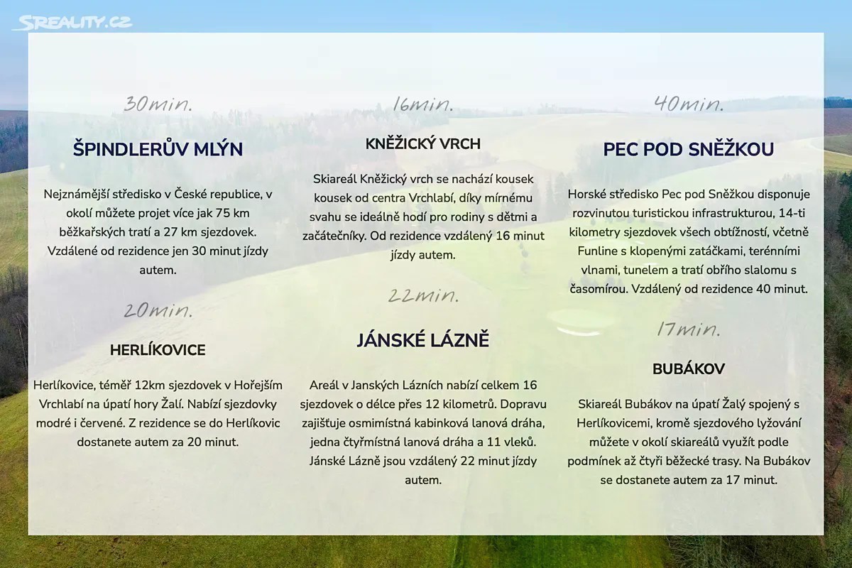 Investiční apartmánový dům v Krkonoších 4 samostatné apartmány | stabilní výnos | klidná horská lokalita Nabízíme k prodeji kompletní apartmánový dům v obci Prosečné, situovaný na severním okraji obce v malebném podhůří Krkonoš. Nemovitost představuje ideální kombinaci vlastního horského zázemí a silné investiční příležitosti s již ověřeným potenciálem krátkodobého pronájmu. ZÁKLADNÍ INFORMACE • samostatně stojící zděný objekt • celkem 4 bytové jednotky • dispozice: 2+1, 1+1, 2+kk a 4+kk • celková započitatelná plocha bytů: 338,74 m² • pozemky celkem: 781 m² • vlastní parkování, terasa, zpevněné plochy • velmi dobrý stavebně-technický stav DISPOZIČNÍ ŘEŠENÍ Dům je rozdělen na čtyři plně samostatné apartmány, každý s vlastním charakterem: • Apartmán 1 (1. NP, 2+1, 91,27 m²) - prostorný byt se sklepem • Apartmán 2 (2. NP, 4+kk, 93,95 m²) - ideální pro větší rodiny • Apartmán 3 (2. NP, 2+kk, 91,11 m²) - komfortní horský apartmán • Apartmán 4 (1. NP, 1+1, 72,42 m²) - skvělý pro páry nebo krátkodobé pobyty Součástí domu jsou společné prostory, technické zázemí a společná půda. TECHNICKÝ STAV A VYBAVENÍ • zděná stavba s nadstandardní tloušťkou nosných konstrukcí • plastová okna s izolačními trojskly • vytápění elektrickými kotli • ohřev vody kombinovanými elektrickými bojlery • kvalitní povrchové úpravy interiérů • pravidelná údržba, objekt je ve velmi dobrém stavu V roce 2021 proběhla modernizace fasády, střechy, výplní otvorů, společných prostor a okolí domu, včetně realizace terasy. LOKALITA - KRKONOŠE NA DOSAH Prosečné leží v klidné části Podkrkonoší, cca 15 km od Trutnova, v okolí lesů, luk a turistických tras. V bezprostřední blízkosti se nachází: • turistika, cyklotrasy • golfové hřiště • lyžařská střediska v dojezdové vzdálenosti • Hostinné, Vrchlabí, Krkonošský národní park Autobusová zastávka je dostupná do 10 minut pěšky, automobilová dostupnost je bezproblémová. INVESTIČNÍ POTENCIÁL Nemovitost je ideální pro krátkodobé pronájmy (Airbn. / B.oking) i kombinaci s dlouhodobým nájemním bydlením. - Odhadovaný výnos při krátkodobém pronájmu: až 9 % p.a. - Stabilní poptávka po ubytování v lokalitě - Možnost okamžitého provozu bez nutnosti zásadních investic Dům je vhodný jak pro čistě investiční záměr, tak pro rodinný resort / penzion s vlastním užíváním. SHRNUTÍ 4 samostatné apartmány horská lokalita s celoroční atraktivitou velmi dobrý technický stav parkování, terasa, pozemek silná investiční návratnost V případě spolupráci s naši RK, kromě kouzelné nemovitosti, vždy dostanete zdarma: - konzultační servis - jazyková vybavenost (mluvíme česky, anglicky, francouzsky, italsky, абв) - právnický servis od AK Hafner & Partneři - servis daňové amortizace - kupony na slevu v top obchodech s nábytkem - stěhování - technika pro drobné úpravy - analýzy trhu