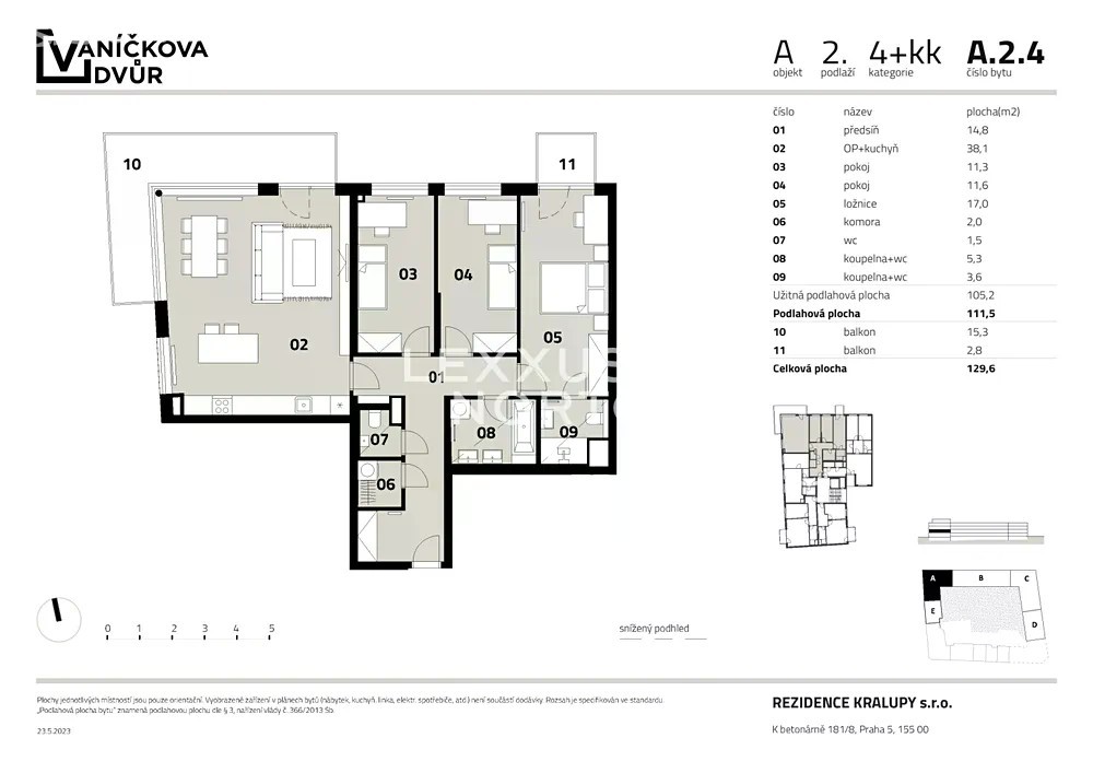 Využijte nyní akci sklep zdarma u vybraných bytů. Moderní projekt Vaníčkova Dvůr vám nabízí k prodeji velkoryse řešený byt s dispozicí 4+kk o rozměrech 111,5 m2 s balkony 18,1 m2. Byt se nachází ve 2. podlaží v nově vznikajícím projektu Vaníčkova Dvůr v srdci Kralup nad Vltavou. V samém centru Kralup nad Vltavou vzniká unikátní projekt šesti bytových domů, který v sobě snoubí jedinečnost moderního bydlení a příjemné prostředí energického města na břehu Vltavy. Vaníčkova Dvůr nabídne 100 nových bytových jednotek 1+kk až 4+kk, podzemní parkovací stání a úložné prostory. Část bytů bude řešena jako jedinečné mezonety, které nemají v lokalitě konkurenci. Součástí projektu bude i privátní vnitroblok plný zeleně s dětským hřištěm. Pro zvýšení komfortu budoucích majitelů je v projektu počítáno s 13 komerčními prostory pro budoucí služby. Projekt nabídne prvotřídní standard a zajistí tak perfektní zázemí pro příjemný život budoucích majitelů. Interiéry bytů ve Vaníčkově Dvoře vynikají nadčasovou elegancí a důrazem na kvalitu. Laminátové podlahy v obytných místnostech doplňuje keramická dlažba v koupelnách a chodbách, okna s izolačním trojsklem zajišťují ticho i tepelný komfort. Koupelny jsou řešeny v moderním stylu s vanou nebo prostorným sprchovým koutem. Architekti věnovali pozornost i společným prostorám - decentní materiály, zelený vnitroblok a promyšlené detaily vytvářejí harmonické prostředí, které přirozeně navazuje na okolní zástavbu. Kralupy nad Vltavou se nachází severně od Prahy mezi Mělníkem a Slaným. Díky své strategické poloze se jedná o vskutku jedinečné místo, spojující snadnou dostupnost Prahy s klidnou atmosférou okolí Vltavy. Lokalita disponuje vším, co by si mohl budoucí majitel přát, veškerá občanská vybavenost, kulturní vyžití, nedaleká příroda, sport i relaxace. Pokud preferujete přírodní krásy, můžete se vydat na skalnaté návrší Hostibejk s vyhlídkovým altánem. Další možností je vypravit se podél řeky Vltavy po tzv. Dvořákově cestě, která spojuje Kralupy nad Vltavou s Nelahozevsí a vede až k tamnímu zámku. Projekt se nachází v centru, v blízkosti vlakového a autobusového nádraží s pravidelnými spoji do Prahy, kam se dostanete pohodlně za 30 minut. Alternativou je přímé napojení na dálnici D8.