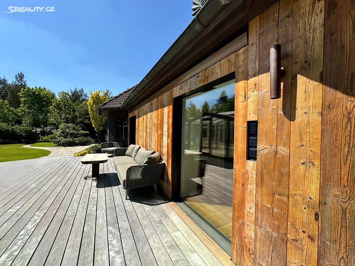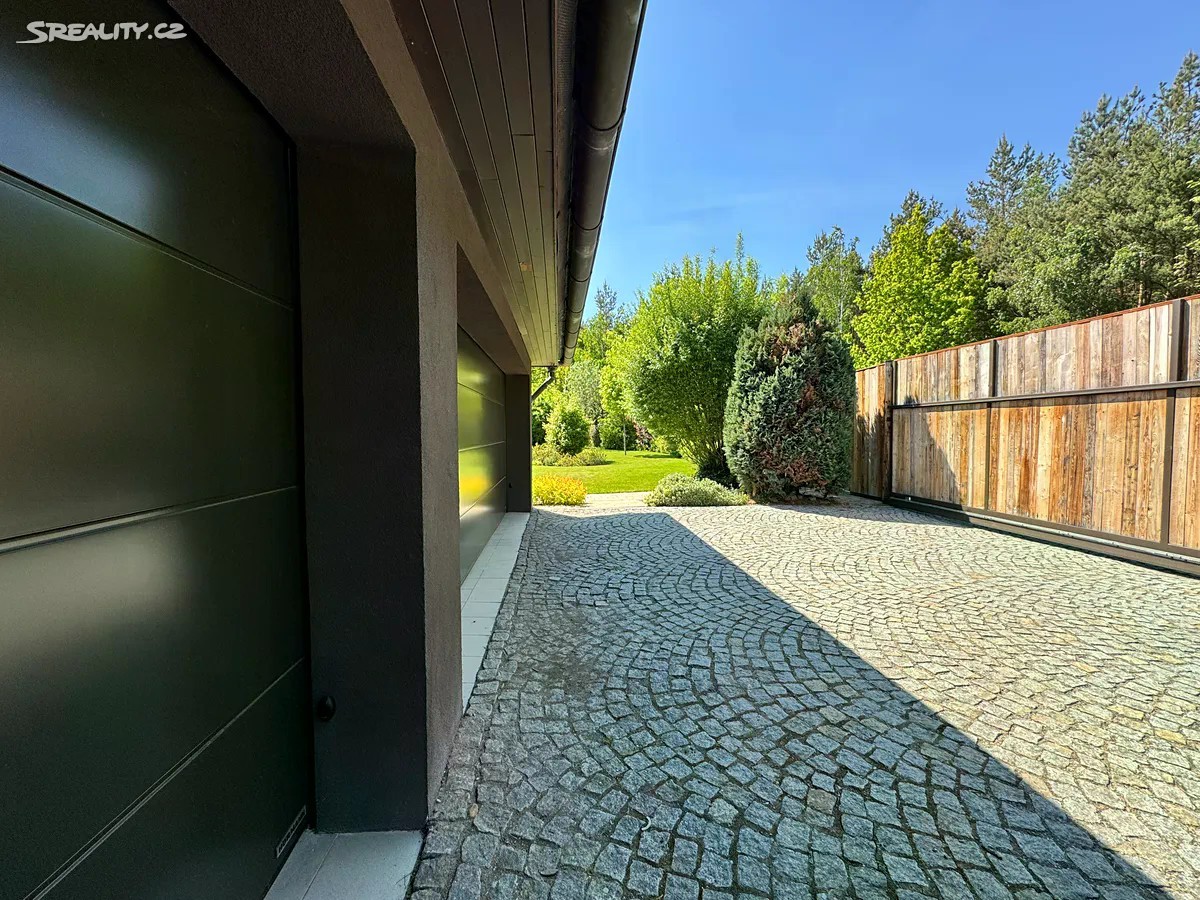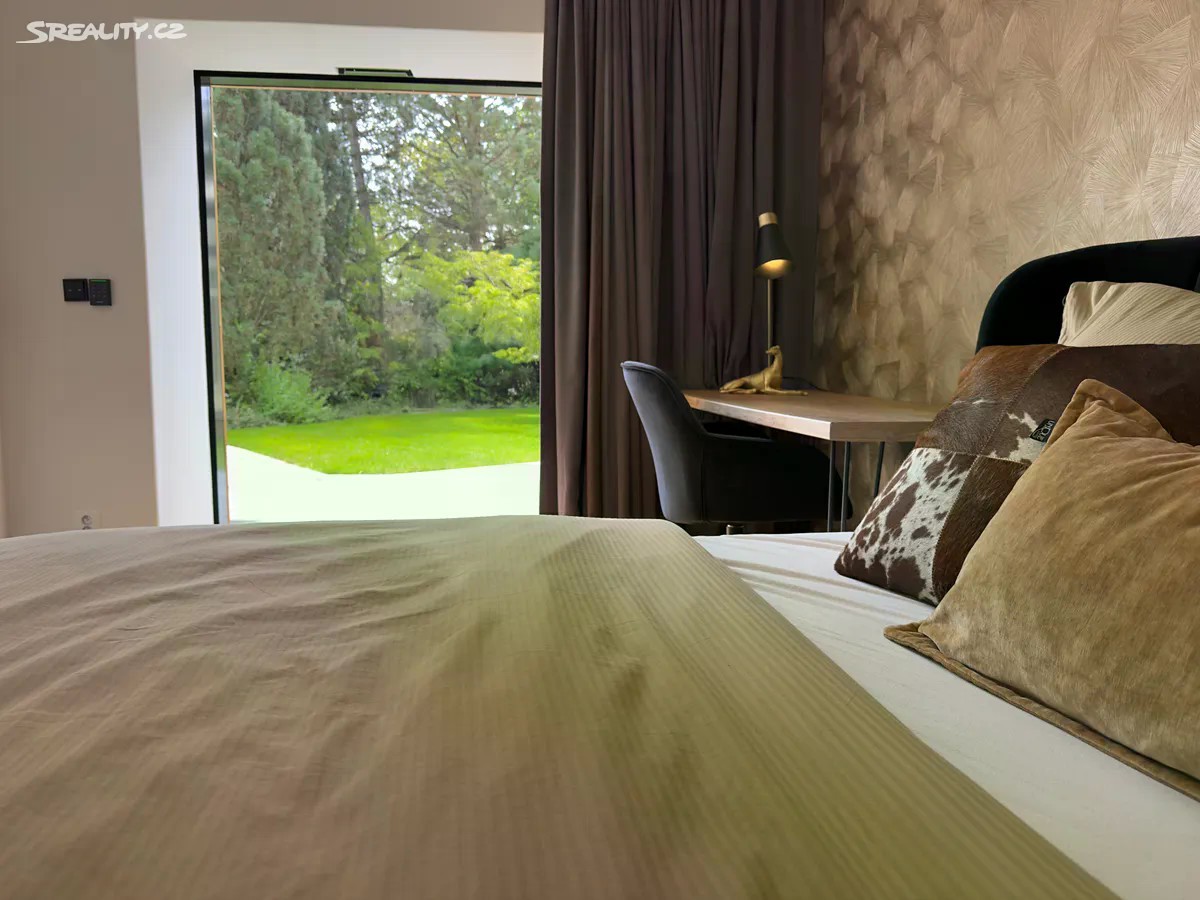 Nabízíme k prodeji samostatně stojící moderní vilu, po kompletní rekonstrukci v roce 2024, nacházející se v klidné části Unhoště u Prahy.Výjimečný pozemek 2 573 m², přímo navazující na lesy CHKO Křivoklátsko. Vila je o celkovéužitné ploše 375 m² má promyšlený půdorys, velkorysá okna a přímé vstupy do pečlivě upravené zahrady. Dispozice zahrnuje 5 ložnic, pracovnu, šatnu, 3 koupelny, kuchyni, obývací pokoj, posilovnu, dvougaráž a další praktické zázemí včetně druhé kuchyně a prádelny. Zastřešený, vyhřívaný bazén s tepelným čerpadlem umožňuje celoroční koupání; hlavní koupelna nabízí vířivku, velkorysý walk-in sprchový kout a luxusní obklady z přírodního kamene. Vytápění zajišťuje tepelné čerpadlo se zemními vrty, samozřejmostí je chytré osvětlení a stínění s blackout závěsy v ložnicích. Zahrada je vzrostlá, členitá, s automatickým profesionálním zavlažováním, řadou klidových zákoutí, altánem, vlastním sportovním hřištěm a zahradním domkem pro hosty či práci; příjezd vede přes elektrickou bránu s parkováním pro více vozů. V docházkové vzdálenosti je golf, restaurace a další volnočasová nabídka, v nedaleké Unhošti kompletní občanská vybavenost; do centra Prahy se pohodlně dostanete autem zhruba za 25 minut. Ideální kombinace nadčasového designu, soukromí a přírody doslova za dveřmi.