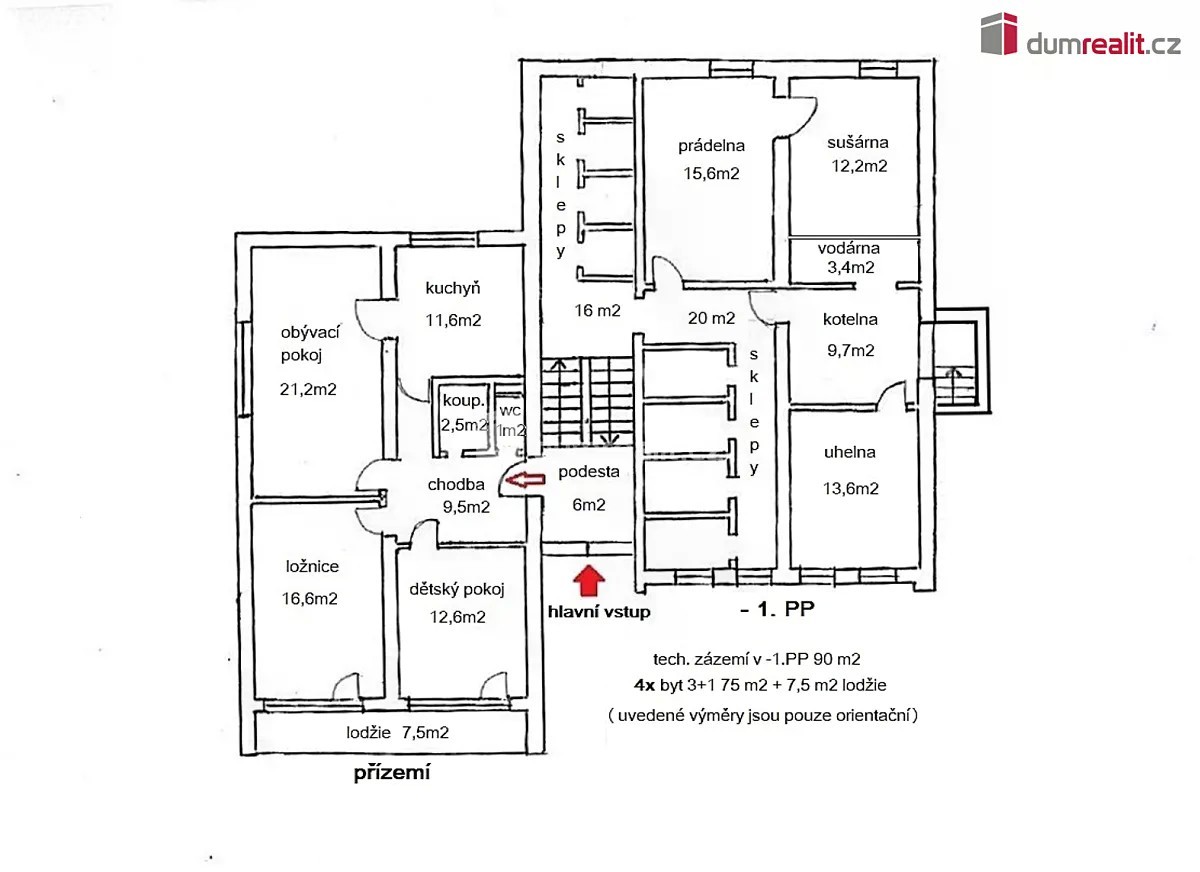Ve výhradním zastoupení majitele Vám nabízím bytový dům o čtyřech bytových jednotkách s celkovou plochou 470 m² na pozemku 1.814 m² v obci Stradonice u Slaného, jen 30min po D7 na metro B Zličín - ideální místo pro velkou rodinu, zázemí firmy a podnikání, nebo developera. Bytový dům (betonový skelet vyplněný cihlami) byl dokončen v r. 1980 a po úpravách kolaudován v r. 1993. Obsahuje tech. zázemí cca 90 m² v -1.PP a 4 stejné byty 3+1 o výměře 75 m² + 7,5 m² lodžie. V domě je dostatek úložných prostor, v -1.PP jsou sklepy, k praktickému využití prádelna a sušárna a u každého bytu je na chodbě úložná komora. Vytápění zajišťuje automatický kotel na uhlí (EURO 5) + el.kotel napojený na radiátory, pro ohřev teplé vody má každý byt el. bojler. Voda je do domu přivedena přes vodárnu ze studny a odpad do jímky, ale v letošním roce je v obci plánováno připojení na obecní vodovod a kanalizaci, realizace nyní probíhá, základní příprava pro napojení u domu je hotová. Dům je plně funkční, před 8 lety byly udělány nové rozvody topení v mědi, jinak je v původním stavu, který si zaslouží rekonstrukci. Před domem je velká zpevněná plocha na parkování a 3 garáže, za nimi na druhé příjezdové cestě k domu lze pohodlně parkovat kamión s návěsem. Na pěkné zahradě (1.417 m²) jsou za domem 4 zděné úložné kůlny a dostatek prostoru k zahradničení, zábavě a odpočinku. Bytový dům se včetně zahrady prodává jako celek, jednotlivé byty nejsou na katastrálním úřadu vymezené (zapsané), proto si je může nový majitel vymezit prohlášením vlastníka dle svého uvážení. V klidné obci je útulná hospůdka u které se v létě konají akce pro děti a venkovní taneční zábavy, dvě nová dětská hřiště, zastávka autobusu do Slaného, veškerá další občanská vybavenost jako mateřské a základní školy, lékaři, velké obchody a vlaková stanice (do Kralup nad Vltavou a Loun) se nachází v blízké sousední obci Zlonice a Klobouky. Jednoduchá cesta autem do Prahy po D6, D7 i D8 kolem 30 min na metro, do 10 min dojezd do Slaného. Dobrá investiční příležitost k podnikání i k vícegeneračnímu bydlení pro velkou rodinu. S vaší hypotékou pomůžeme - zařídíme. Doporučuji. Ev. číslo: 649762.