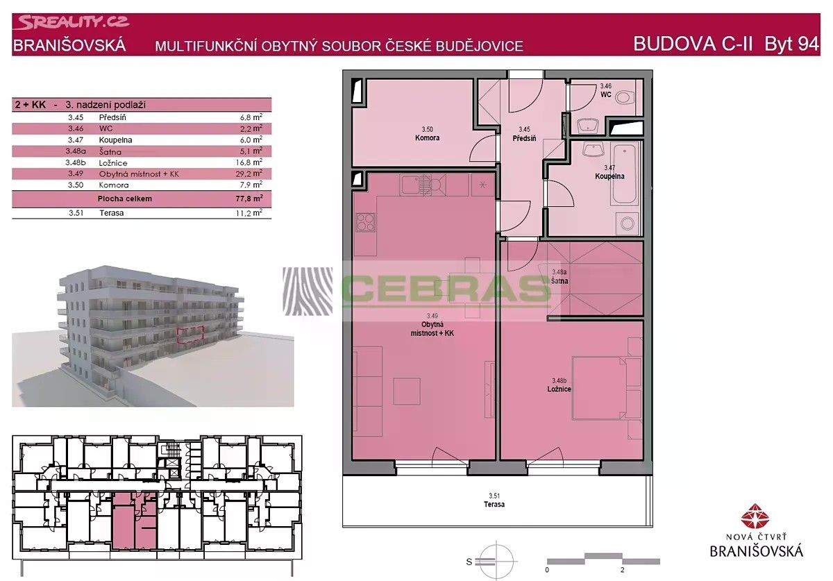 Bydlení, které má styl a prostor! Nabízíme velký a moderní 2+kk (77,8 m²) ve 3. patře novostavby s orientací na západ. Slunce sem svítí celé odpoledne (případně je možné jej regulovat elektrickými žaluziemi) a z terasy (11,2 m²) se otevírá výhled do zeleného vnitrobloku. Každá část působí prostorně a vzdušně. Byt má ložnici s odděleným prostorem, který můžete využít jako šatnu a vstupem na terasu, ze které se dostanete i do obývacího pokoje s plně vybaveným kuchyňským koutem, osazeným modertními spotřebiči. Dále velkorysou komoru (7,9 m2) umístěnou naproti koupelně s vanou a navíc praktický sklep na patře proti výtahu. Bonus: dvě navazující garážová stání najdete přímo v suterénu bytového domu. K dispozici jsou i 2 kolárny. Energetická třída budovy: A - mimořádně úsporná. Okolí poskytuje kompletní občanskou vybavenost - školy, obchody, sportoviště i MHD. Centrum města i příroda - vše je na dosah. Majitel preferuje nekuřáky bez domácích mazlíčků s dobrou platební morálkou. Cena: 21 000 Kč/měsíc, 2 x garážové stání (celkem 2 000 Kč), zálohy na služby 3 950 Kč/ měsíc + elektřina. Vratná kauce: jeden nájem. Poplatek za služby RK činí jeden nájem + DPH. Volné ihned. Detailní informace a celou nabídku kanceláře sledujte na našich webových stránkách. #rkcebras #cebrasrk