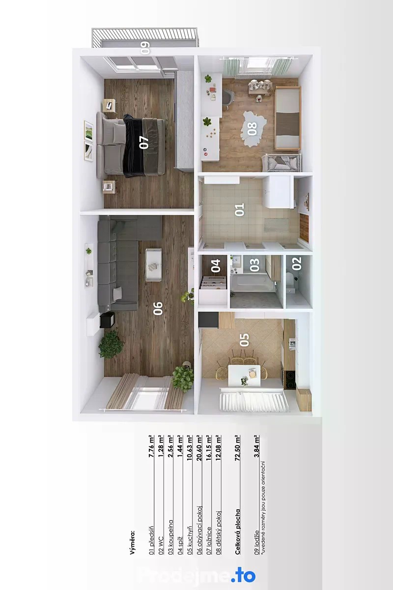 Představuji vám příjemný byt s nadstandardně velkou kuchyňskou linkou v klidné části Přímětic, kde budete mít vše důležité na dosah. + 3+1 + 79 m2 + balkón 2,4 m2 + sklepní kóje 4,3 m2 + velká kuchyňská linka včetně spotřebičů + včetně vybavení + plastová okna + klimatizace + nízké náklady na bydlení + skvělá občanská vybavenost Tento byt s dispozičním řešením 3+1 nabízí plochu 79 m2 + balkón o 2,4 m2. Modernizace interiérů mu dodala svěží vzhled a především skutečně prostornou kuchyňskou linku. Byt se pronajímá s veškerým vybavením, které vidíte na fotografiích. Byt sestává z předsíně s klimatizací, velkého obývacího pokoje, kuchyně s prostornou kuchyňskou linkou včetně spotřebičů, dále pak z dětského pokoje a ložnice se vstupem na balkón. Všechny tyto místnosti prošly úpravami a jsou laděné do světlých dekorů, které podporují příjemnou prosvětlenost celého bytu. Úložné prostory zajišťuje vlastní sklepní kóje o velikosti 4,3 m2. Byt se nachází v nejvyšším patře čtyřpodlažního bytového domu bez výtahu na ulici Krylova. Díky své poloze nabízí nejen klid od ruchu ulice, ale také krásný výhled, ze kterého je vidět až na Znojmo. Přestože jde o nejvyšší patro, horka se v létě bát nemusíte - příjemnou teplotu zajišťuje klimatizace umístěná v předsíni. Bytový dům prošel revitalizací, takže poskytuje pohodlné bydlení s nízkými náklady na energie. Dům leží v těsné blízkosti mateřské i základní školy, dětského a fotbalového hřiště a od supermarketu i bowlingu vás bude dělit méně než 100 metrů. Zastávka MHD propojující Přímětice s centrem Znojma leží necelých 50 metrů od domu. Měsíční nájemné: 15.000 Kč Zálohy na energie a služby: 2.883 Kč Elektřina bude přepsána na nájemce, záloha cca 1.000 Kč/měsíc Vratná kauce: 30.000 Kč Provize RK: ve výši jednoho měsíčního nájemného + DPH 21%