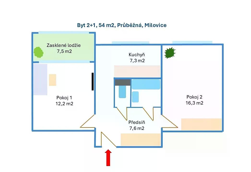 Nabízíme světlý a prostorný byt 2+1 o celkové užitné ploše 54 m navíc s velkou zasklenou lodžií o velikosti 7,5 m2, umístěný ve 4. podlaží dobře udržovaného domu v oblíbené lokalitě Milovic. Dispozice bytu zahrnuje dva neprůchozí pokoje o výměrách 16,3 m2 a 12 m2, kuchyň s okny o velikosti 7,3 m2, vstupní halu 7,6 m2, koupelnu s vanou a samostatné WC. Byt má plastová okna se žaluziemi s jihovýchodní orientací, zděné bytové jádro, nové interiérové dveře a plovoucí podlahy v obytných místnostech. Zvětšená lodžie s nadstandardní hloubkou 2,2 m přímo vybízí k vytvoření dalšího životního prostoru a k příjemnému posezení v teplejších měsících. Dům je po rekonstrukci, má novou střechu i výtah a nachází se ve stabilním, dobře hospodařícím družstvu. K bytu se váže nedoplacená anuita, která k prosinci 2025 činí 370 000 Kč. Nemovitost se nachází v klidné a vyhledávané rezidenční části Milovic s převahou bytových domů s bezproblémovým parkováním. V docházkové vzdálenosti je veškerá občanská vybavenost, mateřská i základní škola, poliklinika, obchody Lidl a Billa, sportoviště i další služby. Velkou výhodou je blízkost vlakového nádraží s přímým spojením do Prahy, přibližně 40 minut dle zvoleného spoje. V případě jakýchkoliv dotazů či zájmu o prohlídku nás neváhejte kontaktovat.
