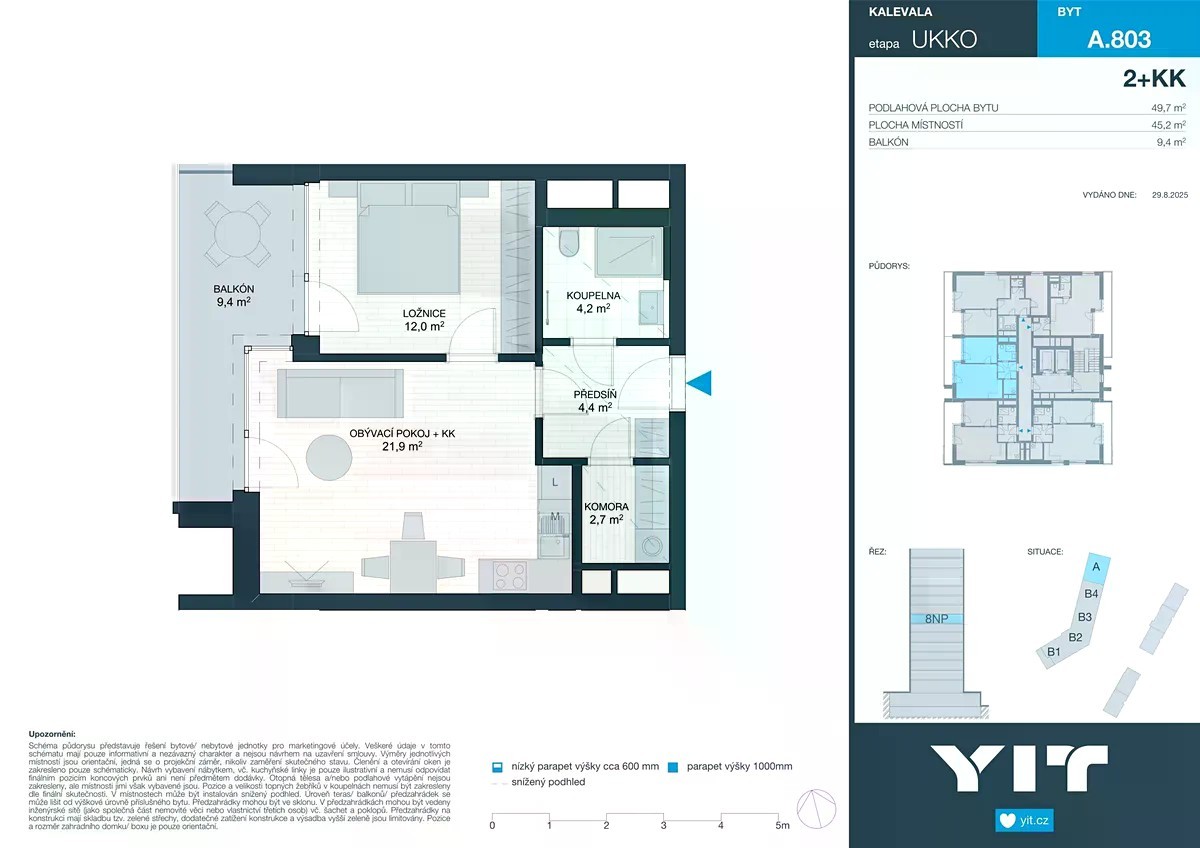 Byt 2+kk o celkové rozloze 49,7 m² je situován v 8.NP projektu KALEVALA etapy UKKO. Cena zahrnuje bytovou jednotku, sklepní kóji a DPH. Cena parkovacího stání od 660 000 Kč včetně DPH. Bytový dům UKKO zahrnuje dvě části budovy - dominantní věž s patnácti a nižší se sedmi nadzemními podlažími. Vyroste mezi ulicemi Viniční, Šedova a Líšeňská. Přinese 183 bytových jednotek a 13 ateliérů o dispozicích 1+kk až 4+kk s velikostmi od 27 m² do 105 m². K většině bude náležet lodžie, terasa či předzahrádka. Součástí se stane také komerční prostor v přízemí věže. Samozřejmostí je dostatek parkovacích stání, sklepních kójí a komor, kočárkárny a místnost pro mytí kol a psů. UKKO tvoří dvě vzájemně pootočené obdélníkové části, jež přirozeně kopírují terén a harmonicky zapadají do nadčasové podoby budoucí čtvrti. Vyšší z obou částí - elegantní věž umístěná ve středu areálu - se stane nejen jeho vizuální dominantou, ale také přirozeným centrem komunitního života. V jejím okolí vznikne prostor pro setkávání, odpočinek i aktivní trávení volného času.