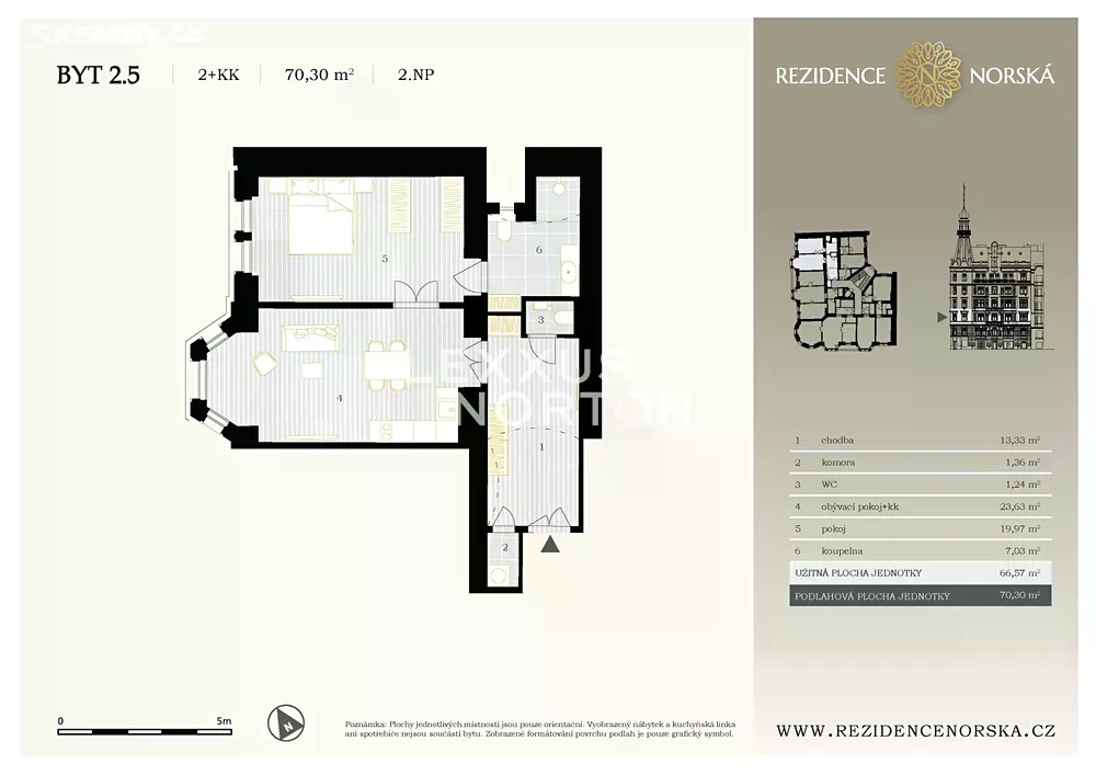 Představujeme byt 2+kk o podlahové ploše 70,30 m², umístěný ve 2. nadzemní podlaží secesní rezidence. Dispozice zahrnuje vstupní chodbu s úložnými prostory, komoru, samostatné WC, koupelnu, prostorný obývací pokoj s kuchyňským koutem a samostatnou ložnici orientovanou do klidné části domu. Díky velkorysé výměře, praktickému řešení a atraktivní lokalitě je byt ideální pro vlastní bydlení i jako investiční příležitost. Rohový secesní dům prošel kompletní a citlivou rekonstrukcí se zachováním původních architektonických detailů ve společných prostorách. Nový výtah zajišťuje pohodlný přístup do všech pater. Projekt je dokončen a byt je ihned k nastěhování. Dubové parketové podlahy, dřevěná špaletová okna, koupelna osazena kvalitní sanitou, plynová kotelna v 1. podzemním podlaží Rezidence Norská se nachází v nárožním domě na křižovatce ulic Kodaňská a Norská, přímo naproti parku Heroldovy sady. Lokalita nabízí ideální kombinaci historického kouzla a moderního městského života - v okolí najdete stylové kavárny, restaurace, kulturní podniky i kompletní občanskou vybavenost širšího centra Prahy. Díky skvělé dopravní dostupnosti se do centra města dostanete během několika minut.
