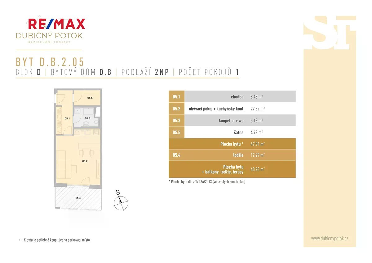 V ceně bytu od nás nyní získáte dárek v podobě vybavení od HANÁK NÁBYTEK v hodnotě 480 000 Kč ZDARMA. Přijďte se podívat do našeho vzorového bytu a zjistěte, co všechno jsme za tuto hodnotu dokázali zařídit! Tato nabídka je časově omezená a nevztahuje se na byty 1+kk. Kompletní nabídku bytů za akční ceny i další bonusy při rychlém jednání až do výše 150 000 Kč najdete na našem webu. Nabízíme exkluzivní bytovou jednotku 1+kk (D.B.2.05) v rezidenci Dubičný Potok v Českých Budějovicích. K prostorné ploše 47,94 m² náleží také velká lodžie 12,29 m², která poskytuje dostatek soukromí i místa k odpočinku. Dispozice 2+kk lze dosáhnout pomocí úpravy formou příčky (není součástí ceny). Touto úpravou si oddělíte spací prostor od obytné místnosti. Neumíte si to představit? Připravili jsme pro vás upravený půdorys, ve kterém vidíte i dispozici po úpravě. Byt je připraven k okamžitému nastěhování. V projektu je k dispozici pohodlné parkování v podzemní garáži a zastávka MHD přímo před domem. V přízemí rezidence brzy vzniknou nové obchodní jednotky, mezi nimi dětská skupina, tetovací studio, kadeřnictví, kosmetika, kavárna a další služby. Nová rezidence Dubičný Potok nabízí moderní a klidné bydlení v zeleni s atriem, revitalizovanou vodní plochou, naučnou stezkou, přírodním hřištěm, workoutovým prostorem, komunitním grilem, interiérovou rezidenční fitness zónou 24/7 a dalšími prvky pro relaxaci. Veřejné prostranství je navrženo udržitelně - zelené střechy spolu s atriem pomáhají optimalizovat mikroklima budov. Součástí projektu je také cyklostezka, kolárna a myčka kol. S financováním vám ochotně pomůže naše finanční oddělení. Vizualizace jsou pouze ilustrativní.